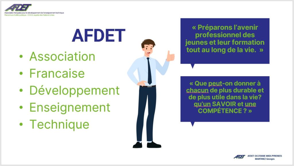 Lorsque la parole fut donnée aux associations partenaires, Georges MARTINEZ la prit au nom de l’AFDET et rappela que celle-ci avait fait du mentorat une priorité, relayée par l’AFDET OCCITANIE Midi-Pyrénées qui s’était mobilisée sur ce sujet dès 2022, en lien avec les MLDS (Missions de Lutte contre le Décrochage Scolaire) et les dispositifs de prévention du décrochage implantés dans les lycées et collèges de l’académie de TOULOUSE. Il insista sur le choix qui avait été fait par ses mentors de rencontrer leurs mentoré(e)s en présentiel au moins deux fois par mois, sans exclure pour autant les autres modes de communication, comme les sms, le téléphone ou la visio. Notre coordinateur a entrepris d’étendre notre accompagnement aux élèves de terminale bac pro, en lien avec les responsables des bureaux des entreprises.